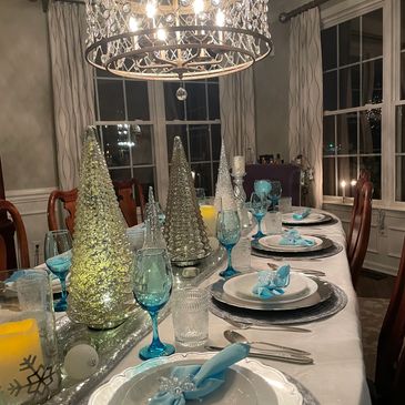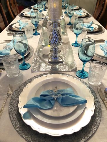 Silver, white, and a light blue. theme filled with sparkle and lights create our Winter Wonderland tablescape. Snowflake accents throughout have us dreaming of a snowy winter.
