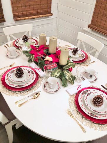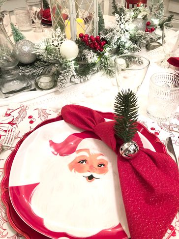 This festive and fun tablescape includes all of Santa's favorites as main plates: the Big Guy himself, Rudolph, Frosty, and a Christmas tree.